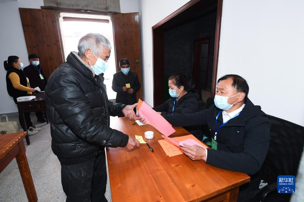 村民在浙江省杭州市臨安區(qū)湍口鎮(zhèn)迎豐村的基層投票點領(lǐng)取選票參加基層人大換屆選舉投票(2021年12月14日攝)。新華社記者 徐昱 攝