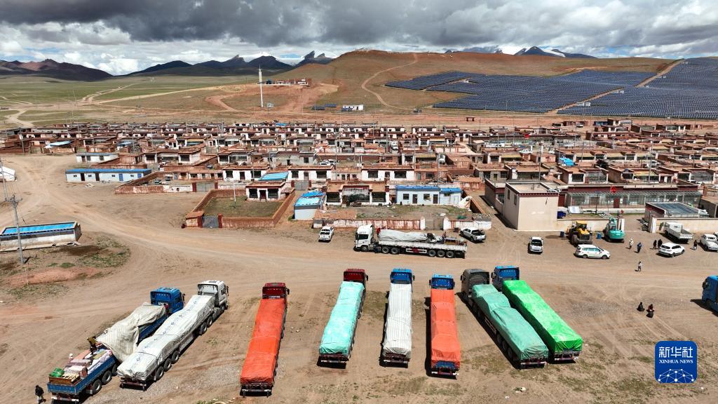 在西藏那曲市雙湖縣多瑪鄉(xiāng)仲魯瑪村,運(yùn)輸家具的貨車(chē)整裝待發(fā)(2022年7月13日攝,無(wú)人機(jī)照片)。新華社記者 晉美多吉 攝