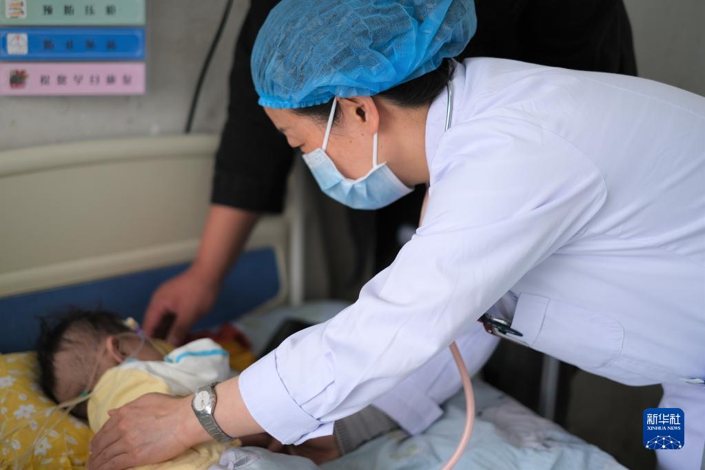 青海省婦女兒童醫(yī)院醫(yī)生、青南支醫(yī)隊(duì)員孫敬在青海省玉樹(shù)藏族自治州人民醫(yī)院給患者檢查身體(2022年4月25日攝)。新華社記者 韓方方 攝