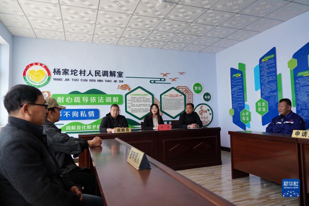 律師甄彩麗(中)在河北唐山灤州市茨榆坨鎮(zhèn)楊家坨村人民調(diào)解室內(nèi)為群眾解答法律問(wèn)題(2021年4月18日攝)。新華社記者 牟宇 攝