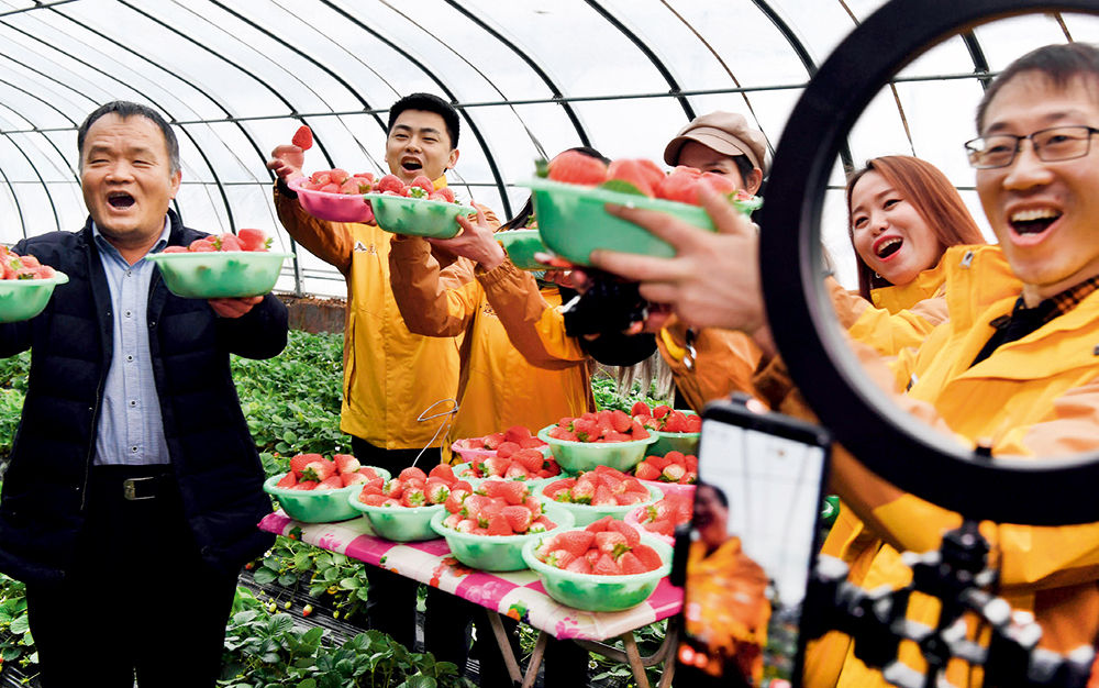一家電商平臺工作人員在陜西省合陽縣金峪鎮(zhèn)溝北現(xiàn)代農(nóng)業(yè)科技示范區(qū)直播推廣草莓(2020110日攝) 陶明攝