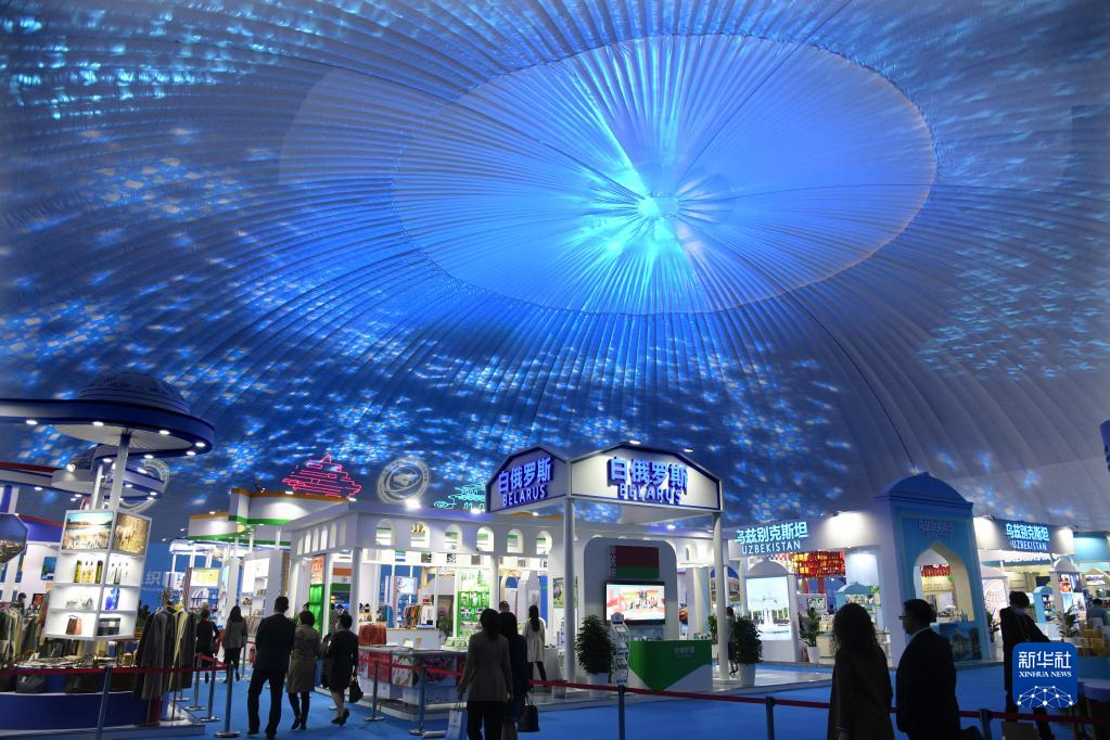 與會嘉賓在各國形象館展區(qū)參觀(2021年4月26日攝)。當日,2021上海合作組織國際投資貿(mào)易博覽會暨上海合作組織地方經(jīng)貿(mào)合作青島論壇在青島開幕。新華社記者 李紫恒 攝