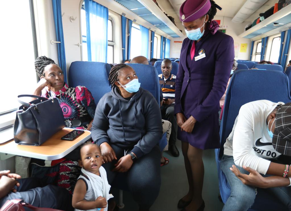 7月29日,列車員菲奧娜(站立者)在蒙內(nèi)鐵路客運(yùn)列車上與乘客交流。新華社記者董江輝攝