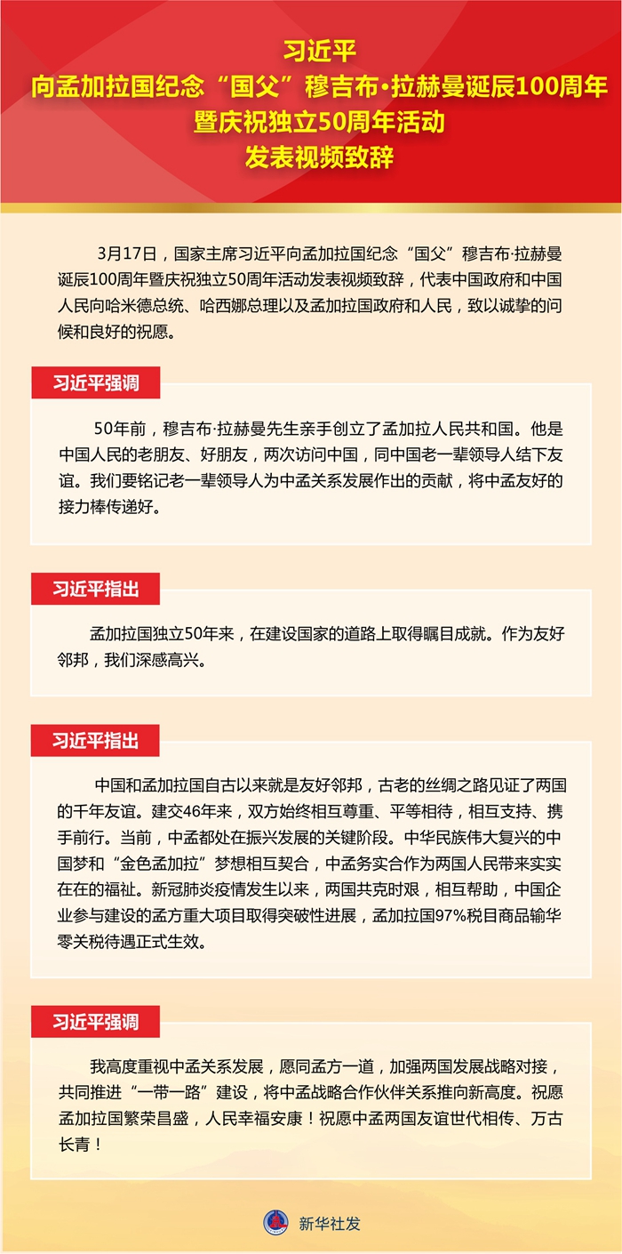 新華社北京 3 月 17 日電 3 月 17 日,國(guó)家主席習(xí)近平向孟加拉國(guó)紀(jì)念 “ 國(guó)父 ” 穆吉布 · 拉赫曼誕辰 100 周年暨慶祝獨(dú)立 50 周年活動(dòng)發(fā)表視頻致辭,代表中國(guó)政府和中國(guó)人民向哈米德總統(tǒng)、哈西娜總理以及孟加拉國(guó)政府和人民,致以誠(chéng)摯的問(wèn)候和良好的祝愿。