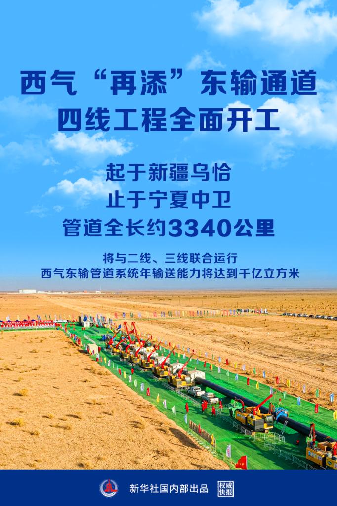 ????新華社北京9月28日電(記者戴小河)國(guó)家管網(wǎng)集團(tuán)西氣東輸四線工程28日正式開(kāi)工,工程起于新疆烏恰縣,止于寧夏中衛(wèi)市,管道全長(zhǎng)約3340公里。