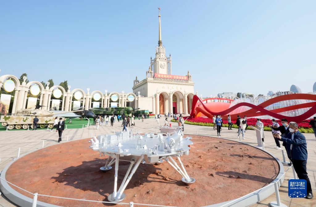 10月7日,觀眾在“奮進(jìn)新時(shí)代”主題成就展上參觀天問一號(hào)著陸器模型。當(dāng)日是國(guó)慶長(zhǎng)假的最后一天,大批觀眾來到北京展覽館參觀“奮進(jìn)新時(shí)代”主題成就展。新華社記者 王毓國(guó) 攝