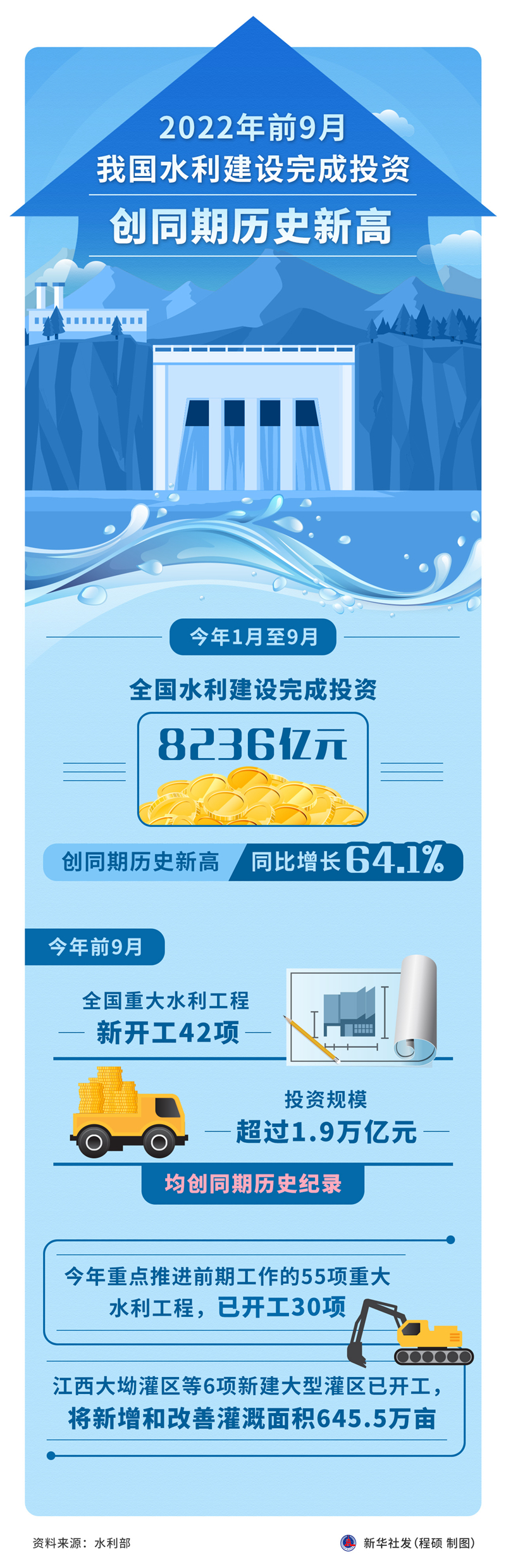 據(jù)水利部統(tǒng)計,今年前9月水利建設(shè)落實投資、完成投資為歷史同期最多:落實水利建設(shè)投資10571億元,同比增長53%;完成水利建設(shè)投資8236億元,同比增長64.1%。