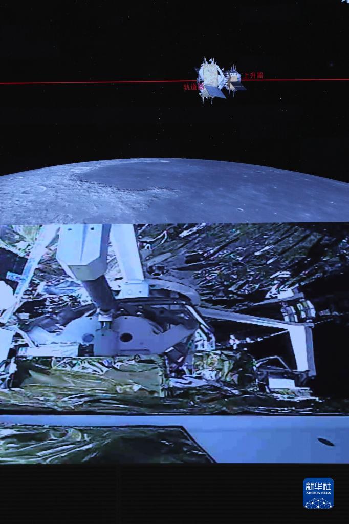 這是在北京航天飛行控制中心指揮大廳拍攝的嫦娥五號(hào)上升器與軌道器返回器組合體交會(huì)對(duì)接畫(huà)面(2020年12月6日攝)。新華社記者 金立旺 攝