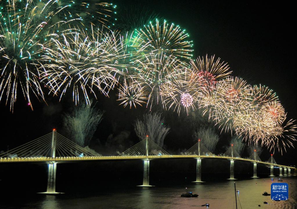 這是在克羅地亞科馬爾納拍攝的由中企承建的佩列沙茨大橋通車(chē)儀式上的焰火表演(2022年7月26日攝)。新華社記者 李學(xué)軍 攝