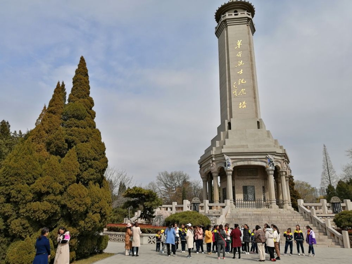 2021年3月18日,小小紅色講解員在位于烈士陵園中央的革命烈士紀(jì)念塔前,學(xué)生們在學(xué)習(xí)講解知識的同時(shí)也接受紅色教育。新華社記者楊文 攝