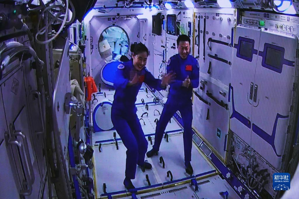 11月30日在酒泉衛(wèi)星發(fā)射中心拍攝的神舟十四號航天員劉洋、蔡旭哲在問天實驗艙迎接神舟十五號航天員乘組的畫面。新華社記者 郭中正 攝