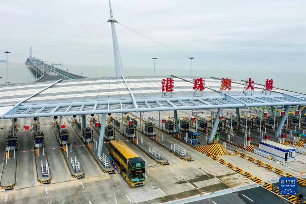一輛從香港開往珠海的港珠澳大橋穿梭巴士入境珠海(2023年1月8日攝,無人機(jī)照片)。新華社記者 劉大偉 攝