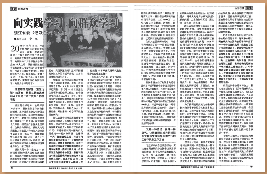 2003年3月,第10期、第11期《瞭望》連續(xù)刊發(fā)費(fèi)強(qiáng)采寫的深度報(bào)道《浙江省委書記習(xí)近平:雙輪驅(qū)動(dòng)提速發(fā)展》《向?qū)嵺`學(xué)習(xí)?向群眾學(xué)習(xí)——浙江省委書記習(xí)近平調(diào)研紀(jì)實(shí)》。4個(gè)月后,浙江省委十一屆四次全會(huì)提出了面向未來要進(jìn)一步發(fā)揮八個(gè)方面的優(yōu)勢(shì)、推進(jìn)八個(gè)方面的舉措,即“八八戰(zhàn)略”。其中的諸多提法,在《瞭望》的上述報(bào)道中已現(xiàn)雛形。