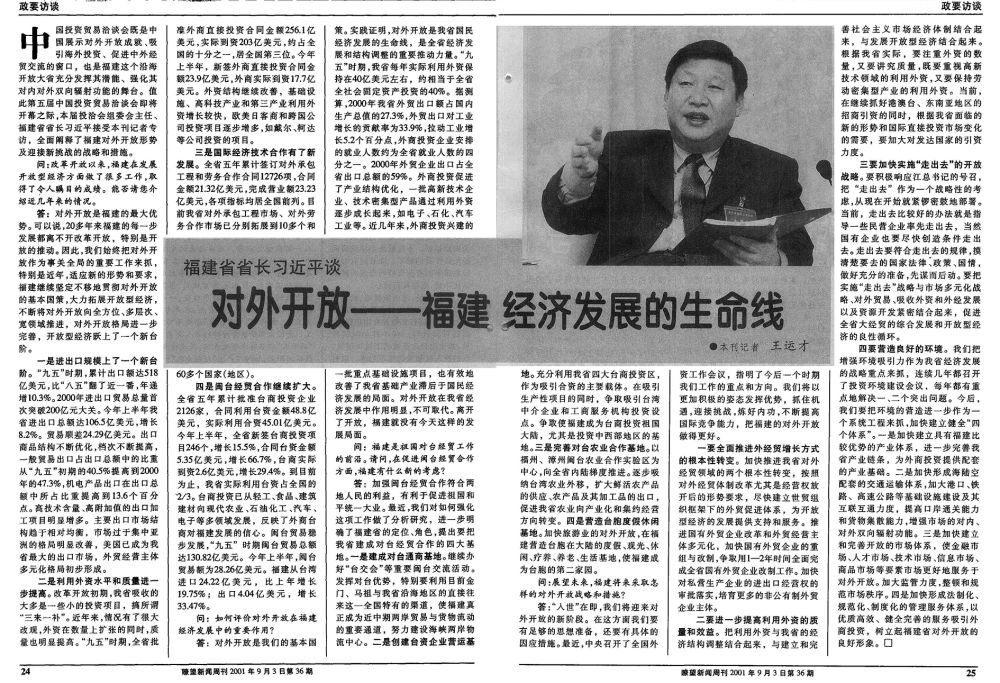 緊接著,我根據(jù)與編輯部商量的意見,向習(xí)近平同志提供了一份采訪提綱,沒幾天,就收到了他接受書面采訪的材料。他在文章中介紹了福建改革開放以來外向型經(jīng)濟(jì)發(fā)展情況,并明確表示,對(duì)外開放是福建國民經(jīng)濟(jì)發(fā)展的生命線,是全省經(jīng)濟(jì)發(fā)展和結(jié)構(gòu)調(diào)整的重要推動(dòng)力量。