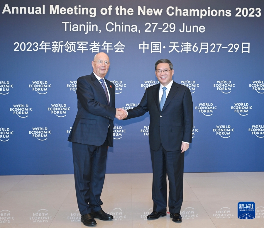 6月26日下午,國(guó)務(wù)院總理李強(qiáng)在天津會(huì)見(jiàn)世界經(jīng)濟(jì)論壇主席施瓦布。新華社記者 岳月偉 攝