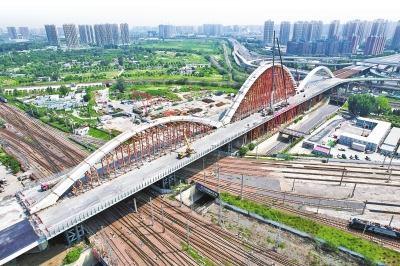 (圖/本報(bào)記者 王錚 攝) ??7月18日,隨著合龍指令的發(fā)出,鄭州新建彩虹橋主橋中跨最后一節(jié)鋼箱拱緩緩放落,橋梁的“彩虹”輪廓初現(xiàn)芳容。 ??“這節(jié)鋼箱拱長(zhǎng)8.4米、寬8米、高2米?!背薪ǚ街需F大橋局彩虹橋項(xiàng)目相關(guān)負(fù)責(zé)人表示,至此,新建彩虹橋的鋼箱拱全部安裝完畢,標(biāo)志著大橋主體結(jié)構(gòu)即將完工,為實(shí)現(xiàn)按期通車(chē)目標(biāo)奠定了堅(jiān)實(shí)基礎(chǔ)。 ??被稱(chēng)為“彩虹橋”的鄭州北環(huán)快速路鐵路跨線大橋,是鄭州北區(qū)東西向的咽喉要道,1994年年底建成通車(chē),由于近年來(lái)交通量逐年增大,橋梁通行壓力較大,該橋經(jīng)過(guò)多次整修仍無(wú)法滿(mǎn)足市民出行需求,2019年拆除重建。 ??據(jù)介紹,鄭州新建彩虹橋上部結(jié)構(gòu)為下承式三跨連續(xù)單拱肋鋼箱系桿拱橋,重2000多噸。預(yù)計(jì)新橋建成后,將大大緩解北三環(huán)東西向的交通壓力,對(duì)于完善鄭州的快速路網(wǎng)結(jié)構(gòu),加強(qiáng)中心城區(qū)與周邊區(qū)域的聯(lián)系等具有重要意義。(記者 李林)