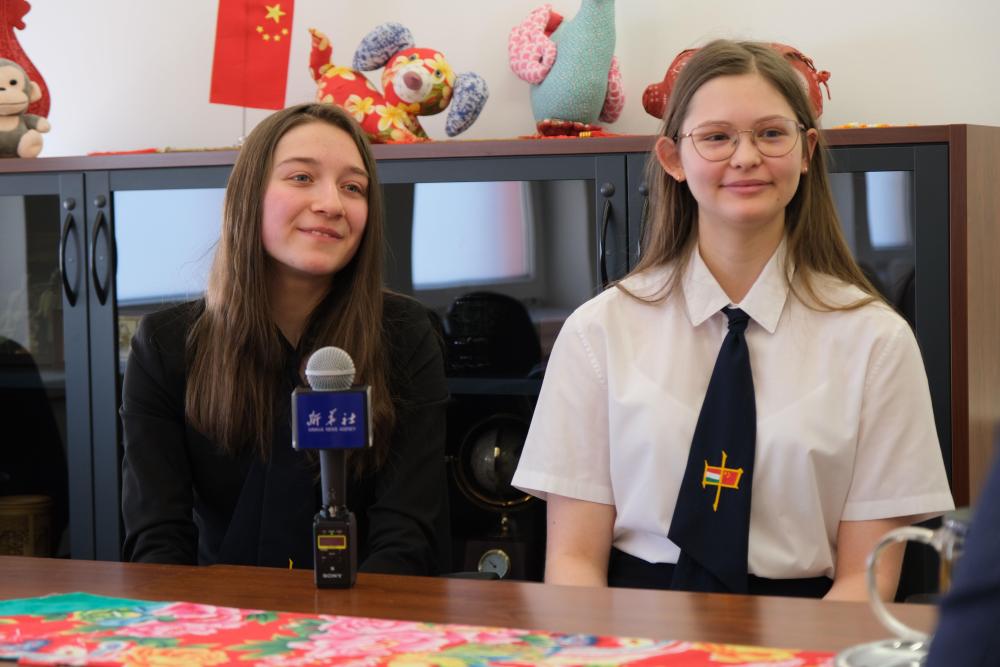 2月7日,在匈牙利首都布達(dá)佩斯,匈中雙語學(xué)校學(xué)生胡靈月(左)和宋智孝接受新華社記者采訪。新華社記者 鄧耀敏 攝