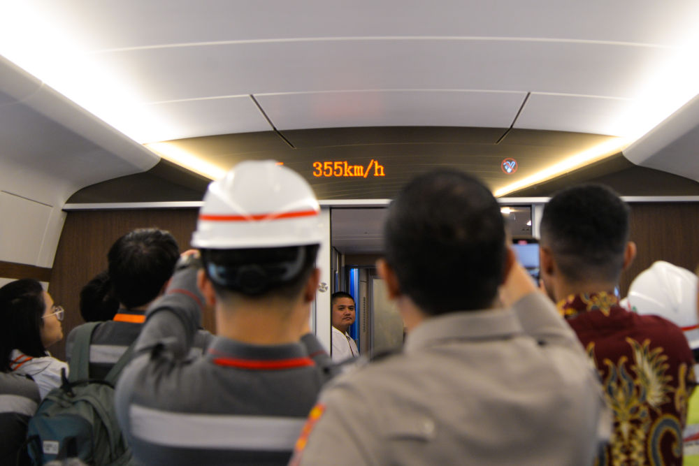 6月22日,印度尼西亞雅萬高鐵聯(lián)調(diào)聯(lián)試綜合檢測列車運(yùn)行時速首次達(dá)到350公里。這是記者和工作人員拍攝顯示列車時速的電子屏。新華社記者 徐欽 攝