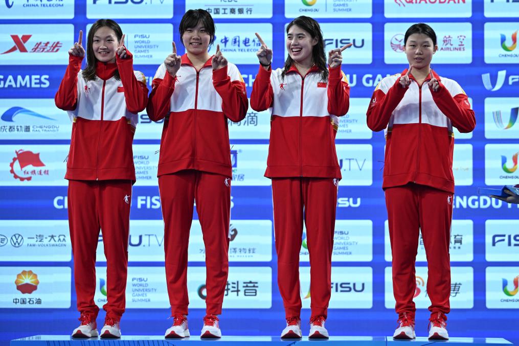 從日本福岡世錦賽凱旋的世界“蛙王”覃海洋和“蝶后”張雨霏當天凌晨才到成都,隨即刷新男子100米蛙泳和女子50米蝶泳的賽會紀錄。張雨霏還率領(lǐng)中國隊以3分37秒51的成績創(chuàng)造了女子4x100米自由泳接力賽會紀錄,開啟成都大運會游泳奪金之旅。