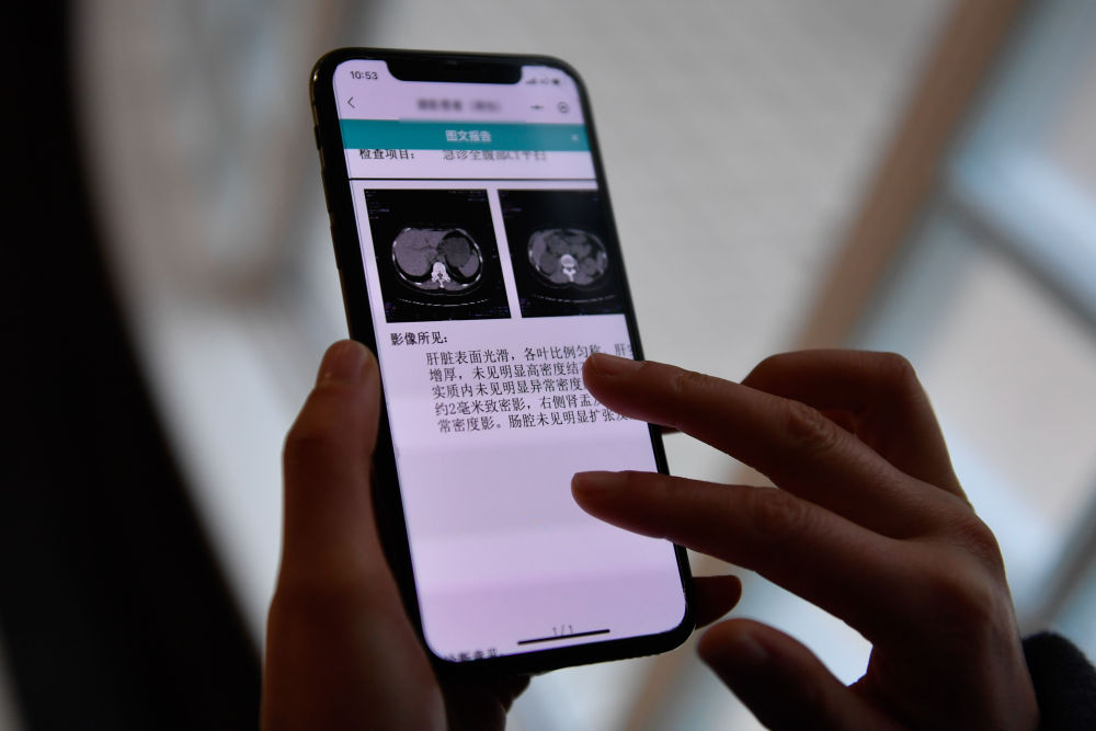 2021年1月20日,在杭州市余杭區(qū)第一人民醫(yī)院,居民通過手機(jī)使用“健康余杭智慧云共享平臺(tái)”查看檢查圖文報(bào)告。新華社記者 黃宗治 攝