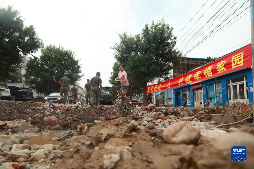 8月7日,武警河北總隊機(jī)動支隊官兵在涿州朝陽大街搬運(yùn)垃圾、清淤清泥、沖洗街道。新華社發(fā) (趙佳亮 攝)