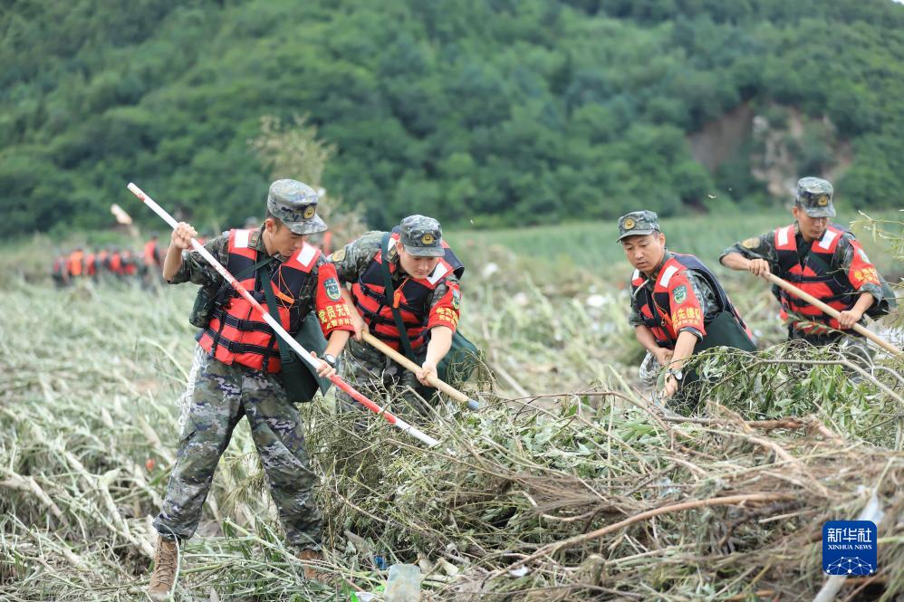 8月7日,陸軍第78集團(tuán)軍某旅組織黨員突擊隊在吉林舒蘭市七里鄉(xiāng)清理路障。新華社發(fā) (劉洋 攝)