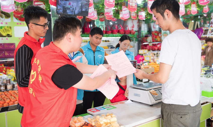 浙江省湖州市吳興區(qū)八里店鎮(zhèn)結(jié)合主題教育和“三服務(wù)”,推進(jìn)“民生大走訪”工作機(jī)制,全體網(wǎng)格員下沉村、社一線,了解社情民意,化解矛盾糾紛,服務(wù)村社群眾。這是八里店鎮(zhèn)中心片區(qū)網(wǎng)格員(藍(lán)衣者)和志愿者(紅衣者)對一家店鋪進(jìn)行平安問卷調(diào)查(2019年10月31日攝)。新華社記者 翁忻旸 攝