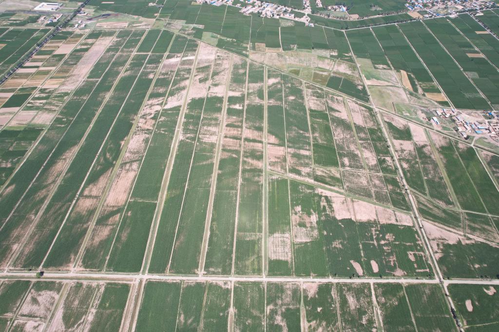 平羅縣一處鹽堿地典型區(qū)域,白色裸露部分為農(nóng)作物難以生長的重度鹽堿地(2023年7月攝)。(平羅縣農(nóng)業(yè)農(nóng)村局供圖)