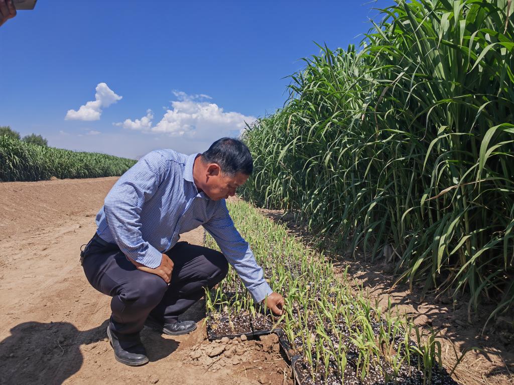 高級(jí)農(nóng)藝師周興德向記者介紹巨菌草幼苗(2023年9月1日攝)。新華社記者馬麗娟 攝