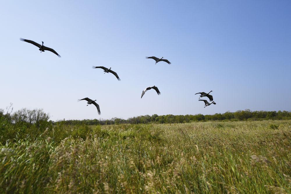 鳥(niǎo)類在山東黃河三角洲國(guó)家級(jí)自然保護(hù)區(qū)內(nèi)飛翔(2022年9月18日攝)。新華社記者 范長(zhǎng)國(guó) 攝