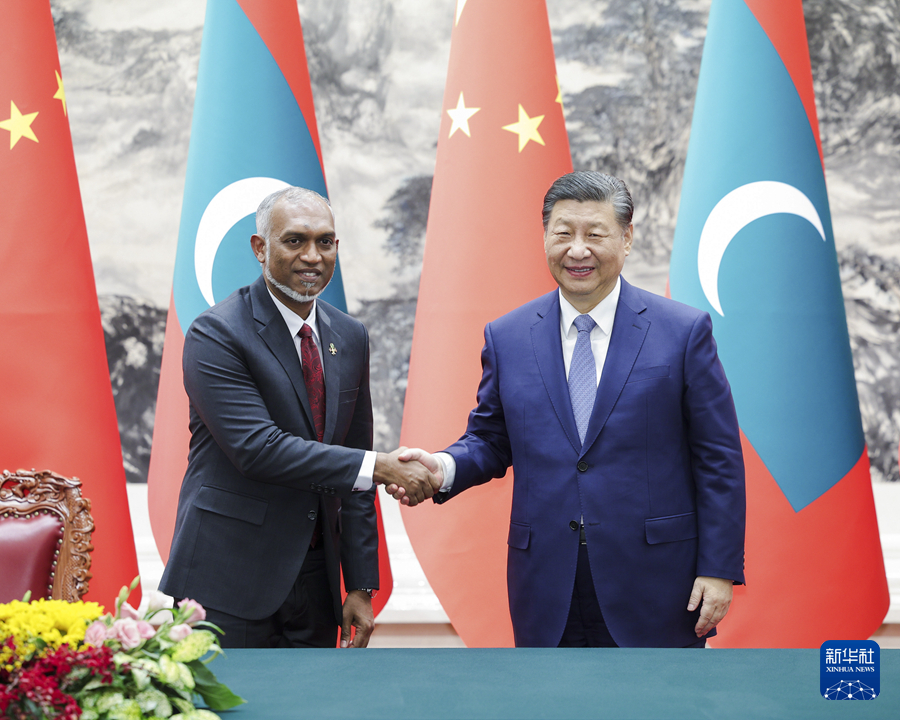 ??1月10日下午,國(guó)家主席習(xí)近平在北京人民大會(huì)堂同來(lái)華進(jìn)行國(guó)事訪問(wèn)的馬爾代夫總統(tǒng)穆伊茲舉行會(huì)談。新華社記者 翟健嵐 攝