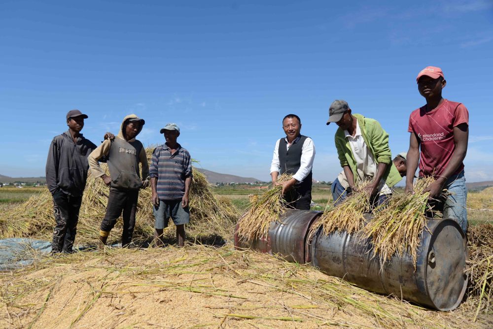 在馬達(dá)加斯加首都塔那那利佛附近的馬義奇鎮(zhèn),中國(guó)雜交水稻技術(shù)專家胡月舫(右三)在中國(guó)國(guó)家雜交水稻工程技術(shù)研究中心非洲分中心的試驗(yàn)田里和當(dāng)?shù)剞r(nóng)民一起收獲水稻(2023年5月12日攝)。新華社發(fā)(西塔卡·拉喬納里松攝)