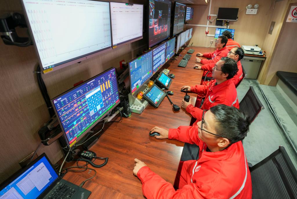 ??技術(shù)人員在重慶涪陵頁巖氣田焦頁5號電驅(qū)壓裂平臺控制室作業(yè)。
