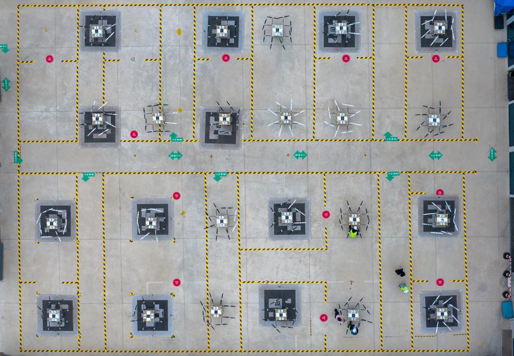 ??在豐翼無人機運營中心,地勤人員對無人機進行起飛前的檢查(無人機照片)。