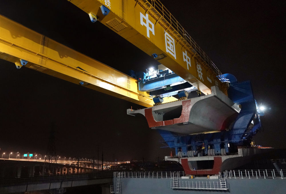 ??這是2024年3月4日凌晨拍攝的滬蘇湖鐵路全線最后一榀箱梁架設(shè)施工現(xiàn)場(chǎng)。當(dāng)日,滬蘇湖鐵路全線箱梁架設(shè)完成。