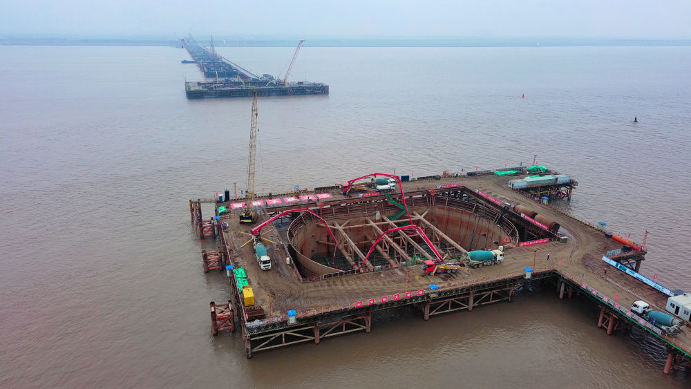 ??2024年3月27日,在江蘇啟東長(zhǎng)江入海口北支航道江面施工現(xiàn)場(chǎng),上海至南京至合肥高鐵控制性節(jié)點(diǎn)工程——崇啟公鐵長(zhǎng)江大橋3、4號(hào)主墩承臺(tái)首次澆筑完成。