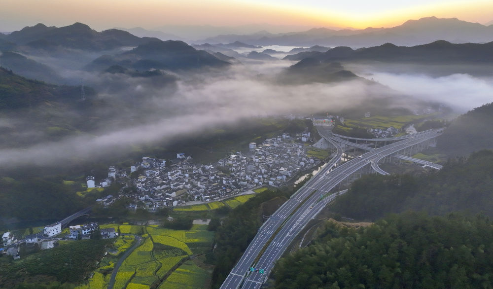 ??這是2024年3月20日拍攝的位于安徽省黃山市歙縣的黃千高速公路。黃千高速公路依山傍水,是連接安徽黃山和浙江千島湖兩大景區(qū)的旅游快速干線(無人機(jī)照片)。
