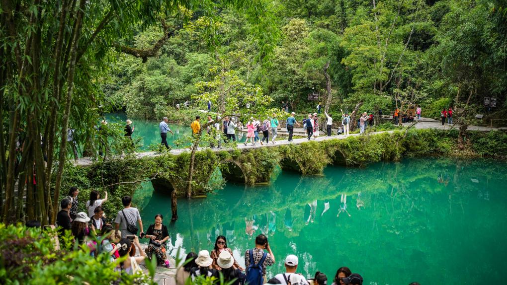 初夏時(shí)節(jié),貴州省黔南布依族苗族自治州荔波縣小七孔景區(qū)綠意盎然、風(fēng)光秀美,吸引眾多游客前來(lái)觀(guān)光游玩。新華社記者 陶亮 攝
