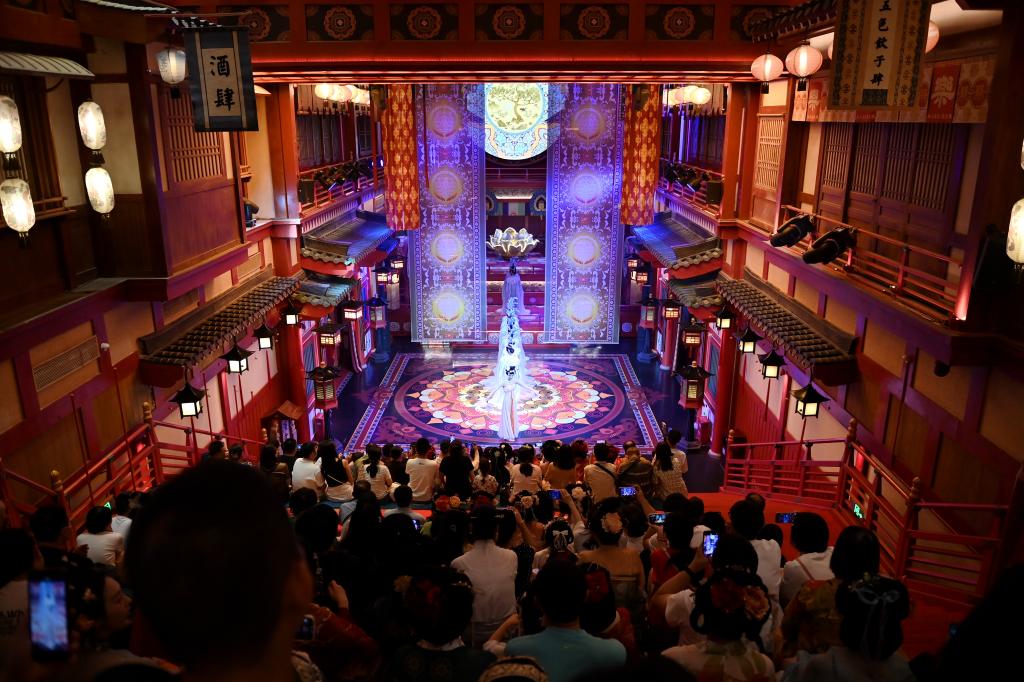 2024年5月12日,游客在西安長(zhǎng)安十二時(shí)辰主題街區(qū)內(nèi)觀(guān)看演出。新華社記者 李一博 攝