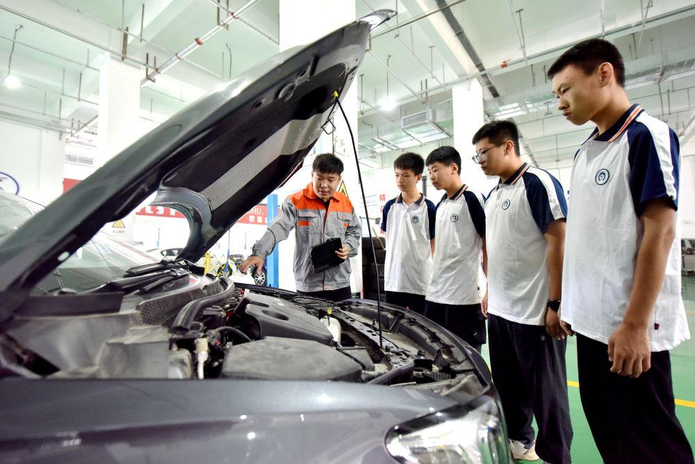 ??2024年6月7日,河北省邢臺市威縣職業(yè)技術(shù)教育中心教師在指導學生學習汽車維修技術(shù)。新華社記者 王曉 攝