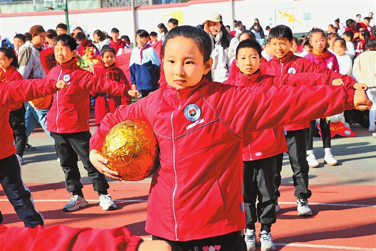 10月24日,焦作市解放區(qū)幸福街小學(xué)學(xué)生正伴隨著音樂跳自編的韻律操。自秋季新學(xué)期開學(xué)以來,該區(qū)開展形式多樣、內(nèi)容豐富的特色體育教學(xué)活動,自編自創(chuàng)體育活動項目,讓學(xué)生們通過別樣的體育活動強(qiáng)健體魄。李良貴 攝