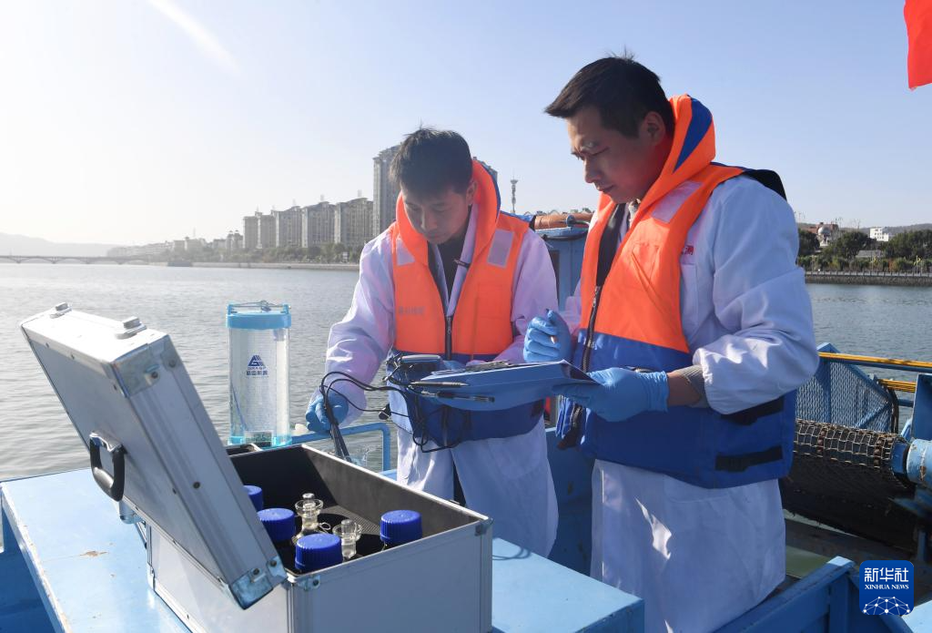 ??11月28日,在淅川縣鸛河流域城區(qū)段,南陽市生態(tài)環(huán)境局淅川分局工作人員記錄采樣水質情況。