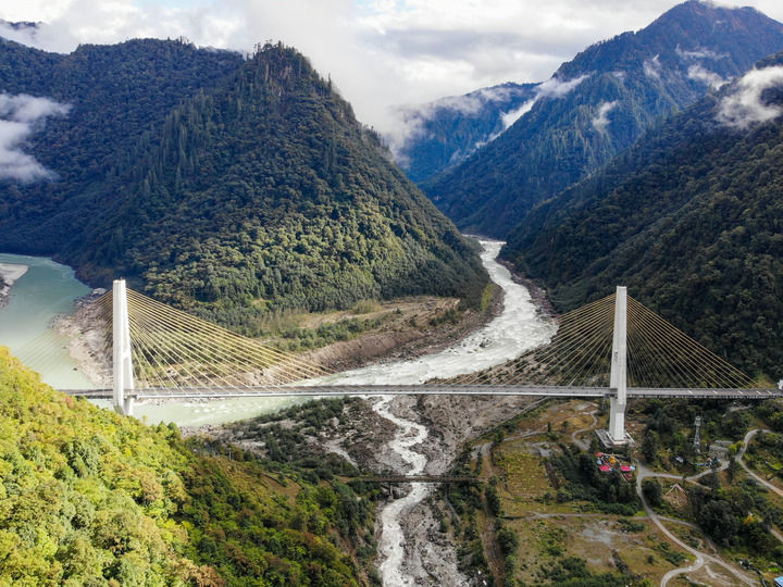 ??2019年10月27日拍攝的川藏公路通麥路段上的迫龍溝特大橋(無人機(jī)照片)。迫龍溝特大橋位于西藏林芝市波密縣境內(nèi),是西藏自治區(qū)內(nèi)最大的公路雙塔斜拉橋。新華社記者 孫非 攝