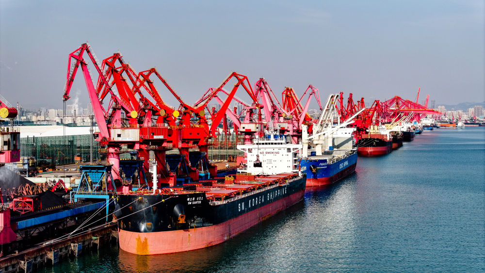 ??在山東港口日照港煤炭泊位,貨輪停泊卸煤(2024年12月4日攝,無(wú)人機(jī)照片)。新華社記者 郭緒雷 攝