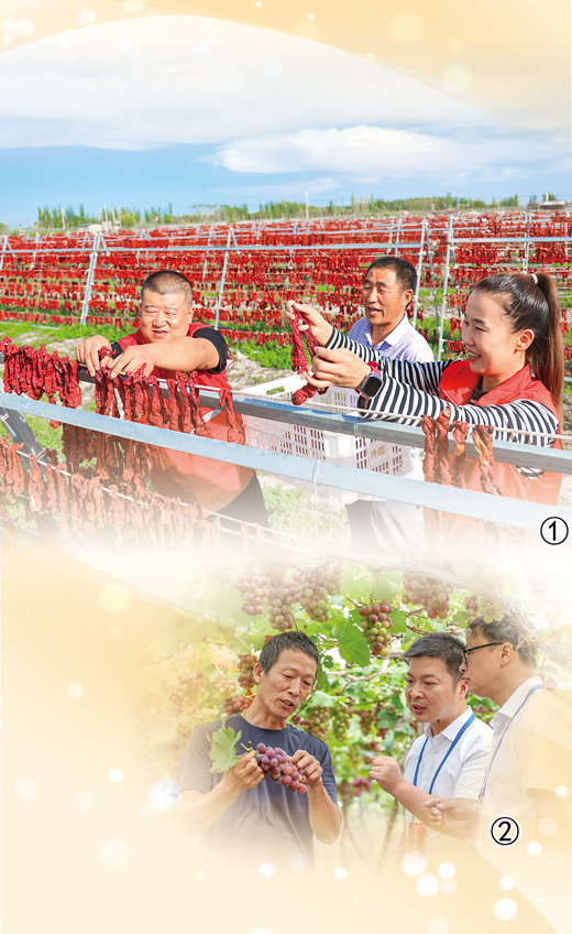 圖①:新疆維吾爾自治區(qū)博湖縣塔溫覺肯鄉(xiāng)辣椒曬場上,黨員志愿服務(wù)隊幫助村民晾曬辣椒。